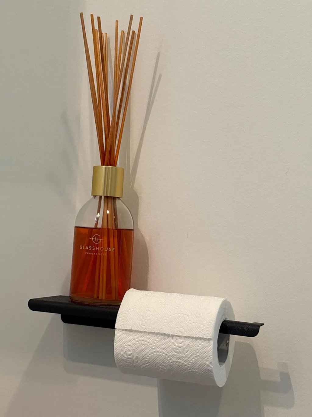 Werten Sie Ihr Badezimmer mit dem wandmontierten Toilettenpapierhalter und Regal Modo auf. Dieses elegante Stück vereint Stil und Funktionalität und bietet praktischen Platz für Toilettenpapier und kleine Gegenstände wie Telefon, Schlüssel oder Parfüm.