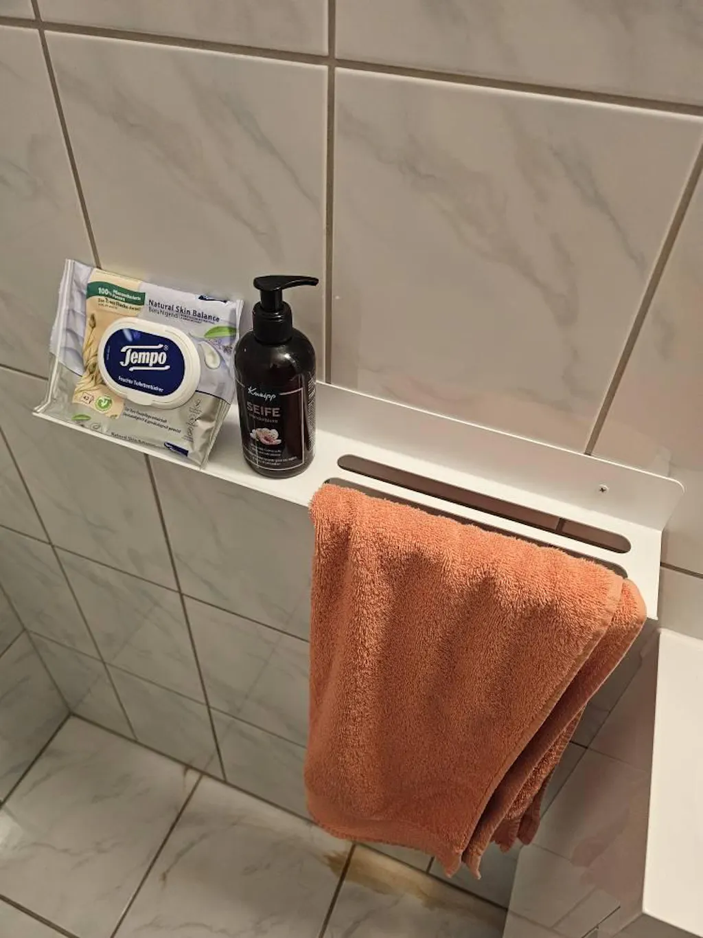 - Multifunktionales Design: Integriertes Regal für Toilettenartikel, Kerzen oder kleine Dekorationsartikel und eine Halterung für Handtücher.